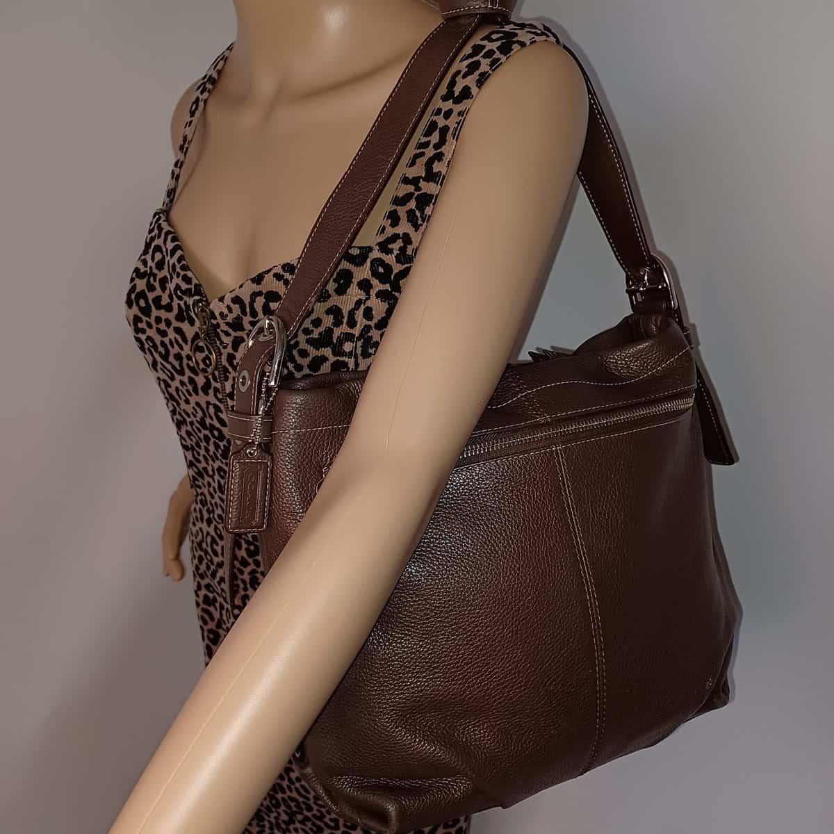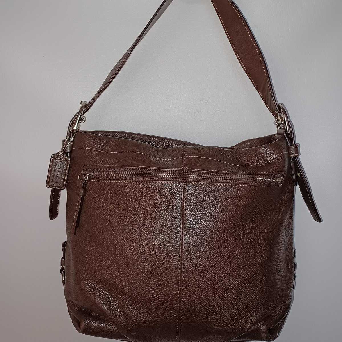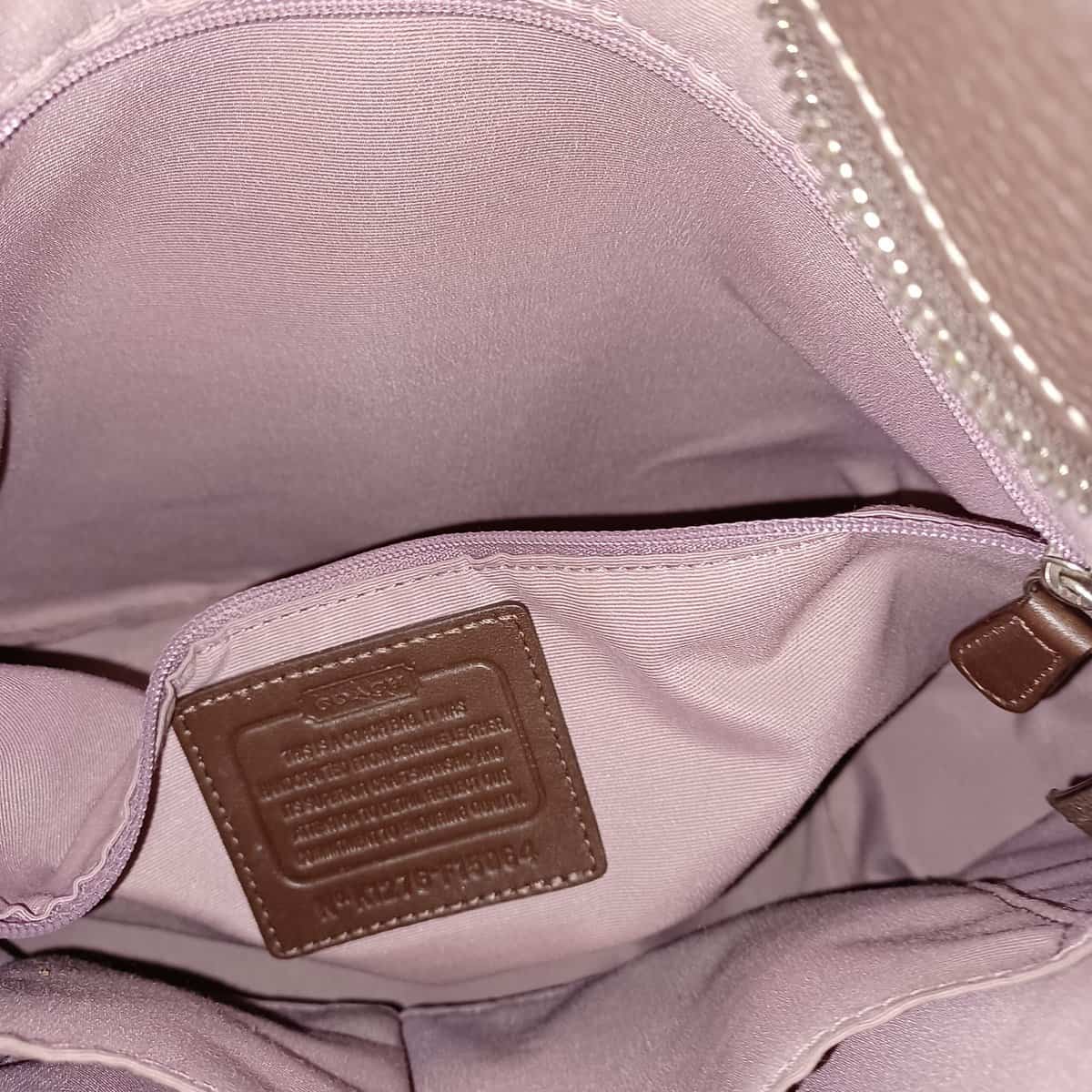 DIMENSIONS: 12.25″ (L at top) 11″ (H) 3.5″ (D) EXTERIOR FEATURES Lightly Pebble-Grain Cowhide Leather Zip Top Closure With Leather Tassel Pull Silver Hardware Bag Can be Worn Over Shoulder With Strap Doubled or Cross Body when Single Full Length Zipper Pocket in Back of Bag Coach Leather Hangtag INTERIOR FEATURES Large Roomy Interior Fully Lined in Lilac Color Fabric Full Length Zip Pocket With Leather Tab Pull Coach Authenticity Patch on Pocket Two Multifunction Pockets