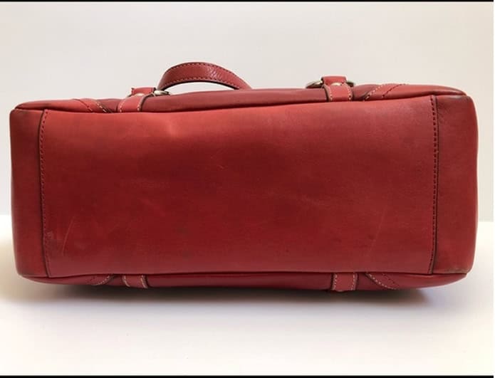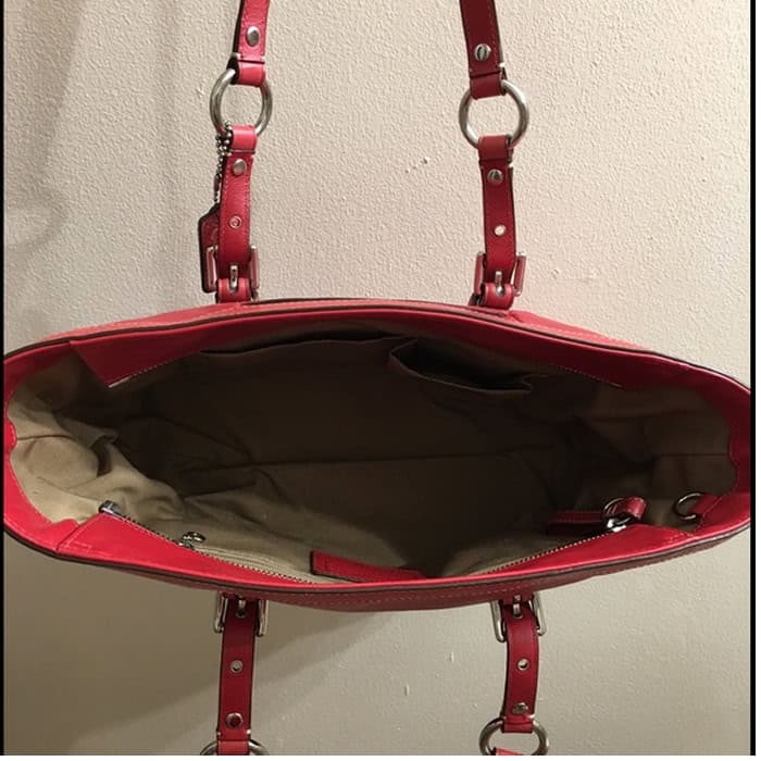 COACH MAGNIFICENT RED LEATHER SHOULDER BAG PURSE.A superb leather, soft and buttery. The tone of the red is really what strikes me. It’s two tones of red. The corners and bottom are a coral red, and the rest of the bag is a deep Ferrari red.Silver tone hardware, buckles and eyelets.Front slip pocket 5″. Side slip pockets with turn lock.Inside is a khaki semi gloss lining with zippered pocket and two slip pouches.Great condition, minor wear, a few minuscule spots, that are nearly impossible to detect.Please feel free to check out our images, as well as other Coach items within our store. Every item we sell regardless of cost/price receives the same great treatment and photographic care/time. All items are checked, cleaned and/or polished before reaching you. We are a smoke free home.Items normally ship same day or next morning! Excluding Sundays and holidays.
