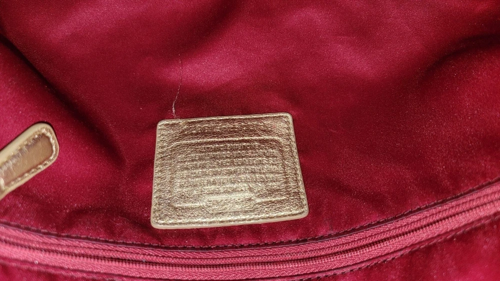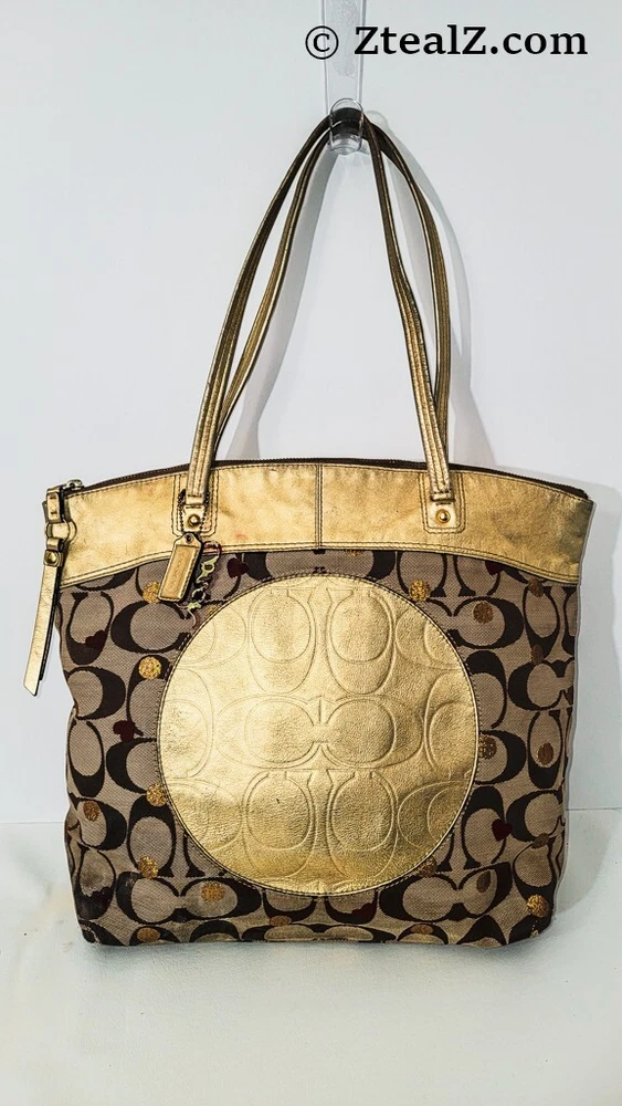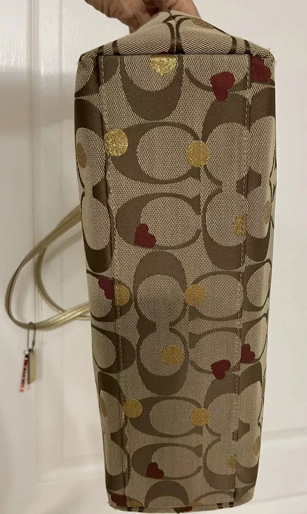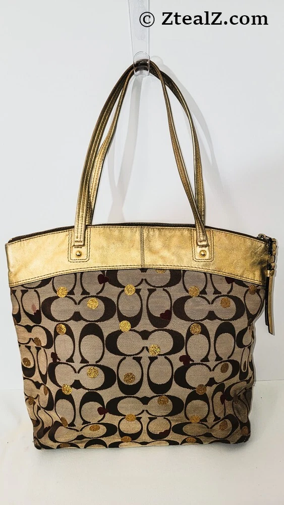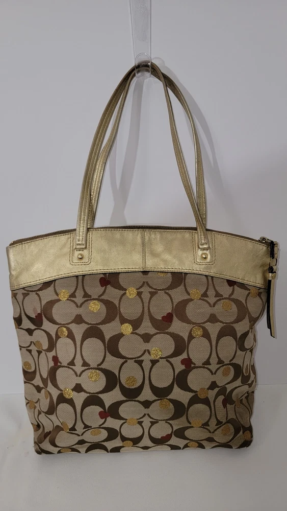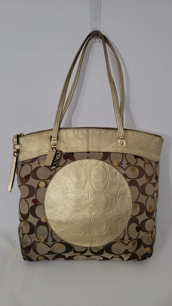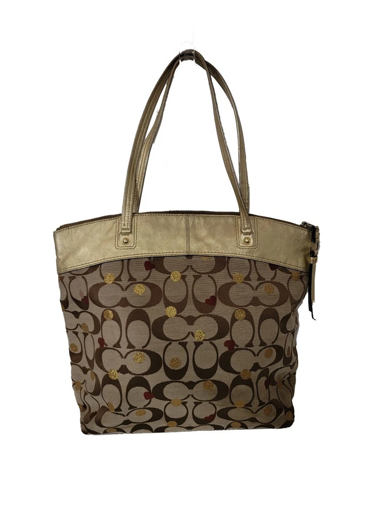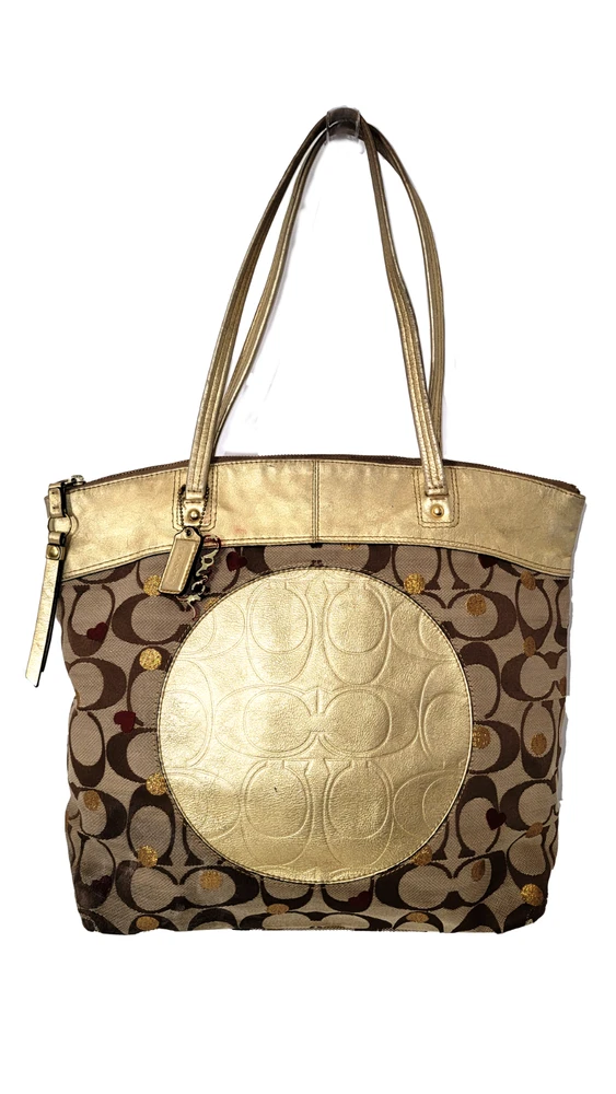 Carry quiet confidence with Coach Metallic Gold & Beige Laura Secret Admirer Tote #18870 in Gold. Thoughtfully sized to keep essentials organized without bulk. A versatile piece that moves from coffee runs to evenings out with ease.