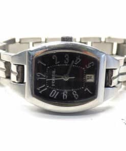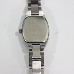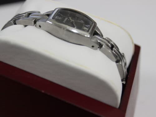 Dress/casual watch, Quartz movement, Polished silver-tone hands and numbers, Gray markers and indices, Analog date display, Polished silver-tone stainless steel bezel, textured crown and caseback, Polished/brushed silver-tone stainless steel barrel shaped case, 30 meters/100 feet water resistant