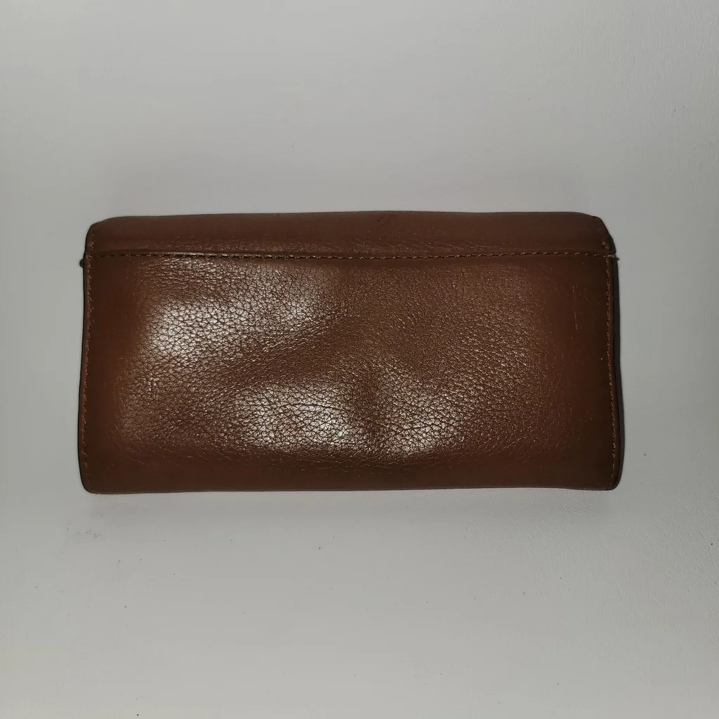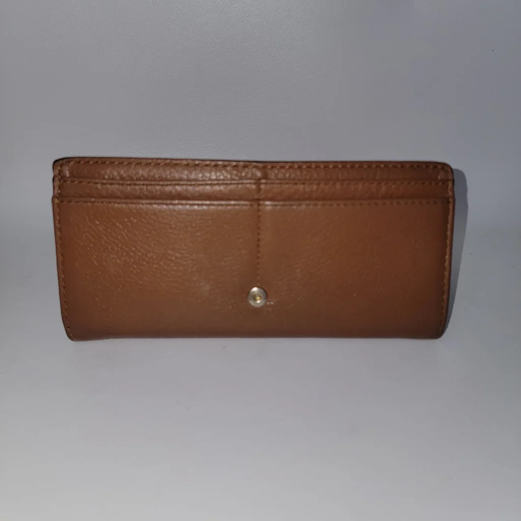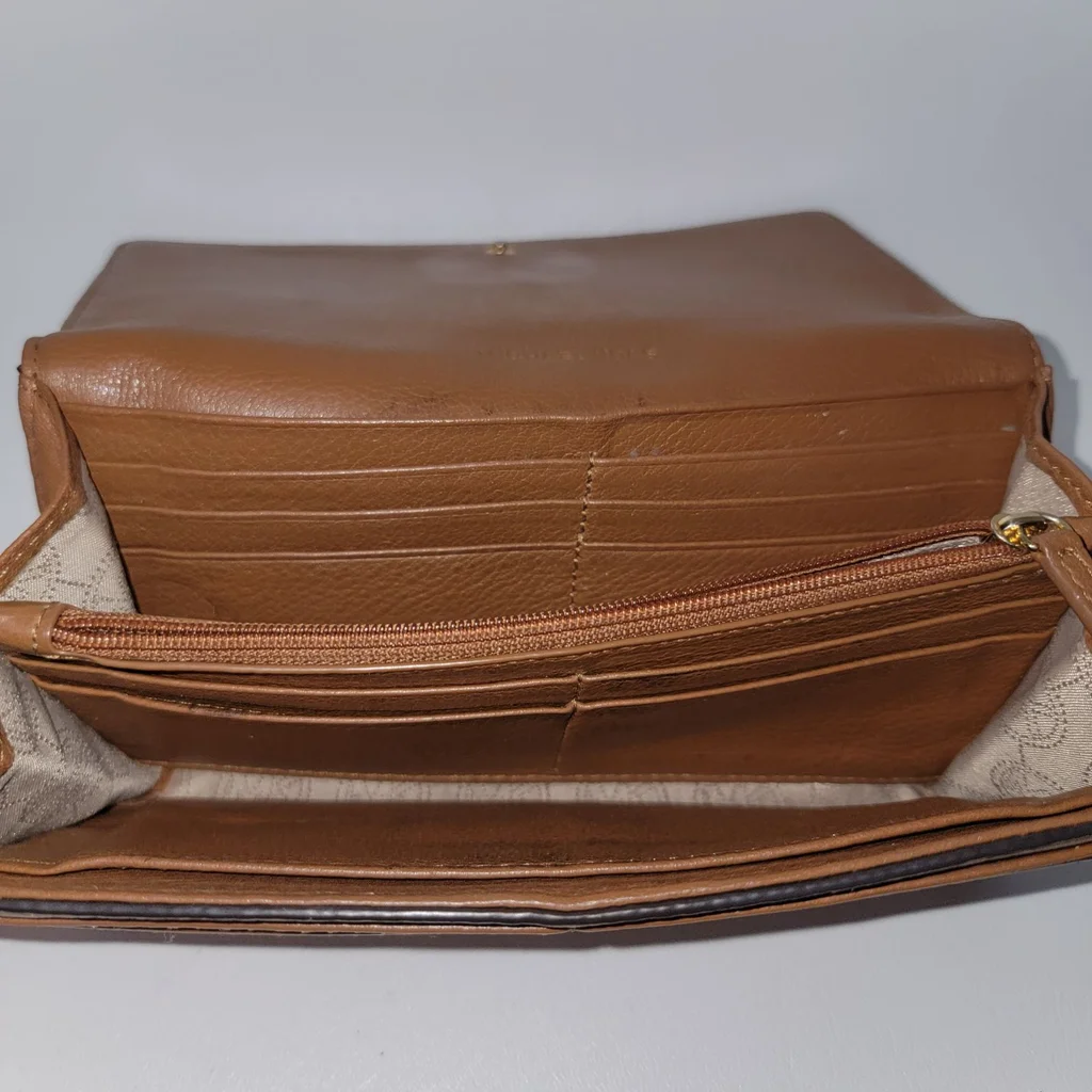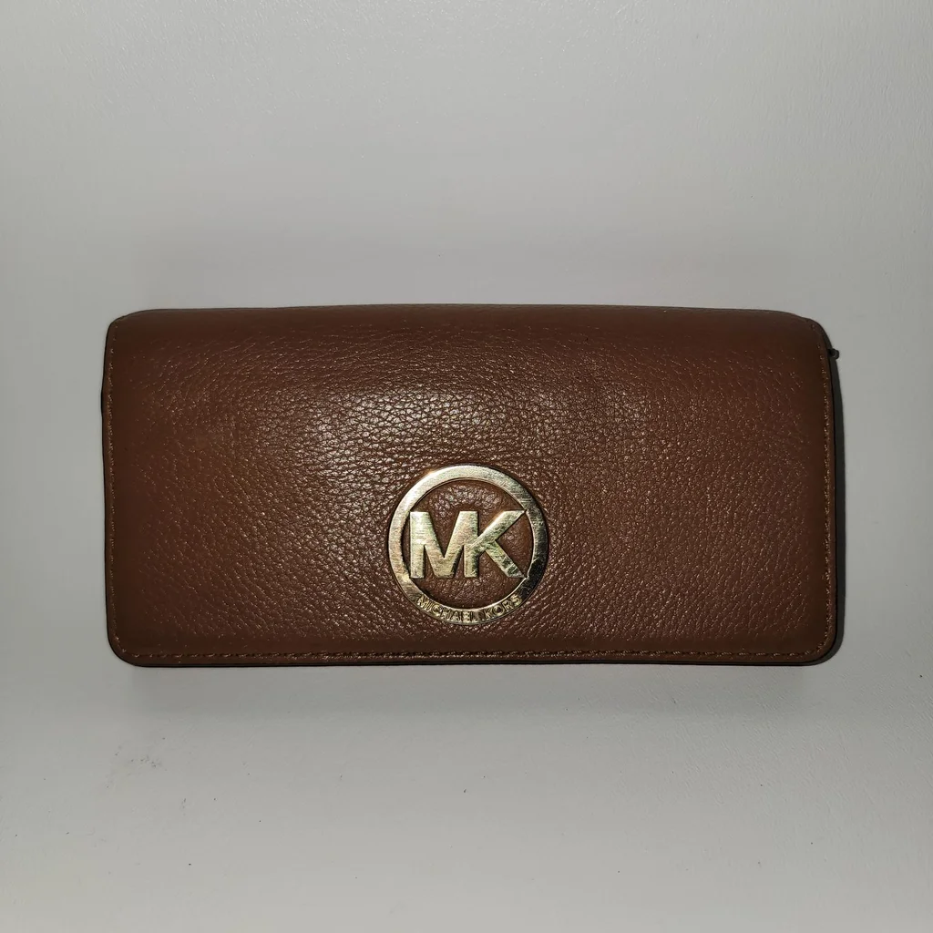 A Michael Kors caryall wallet styled in leather construction with gold-tone hardware. This Michael Kors carryall features a flap front with a logo medallion, a snap button closure, an outside pocket and lined interior with one zip divider, two bill pockets and 14 card slots. Dimensions: 7.5 inches W x 4.5 inches H x 1 inch D Michael Kors 32F2GFTE3L